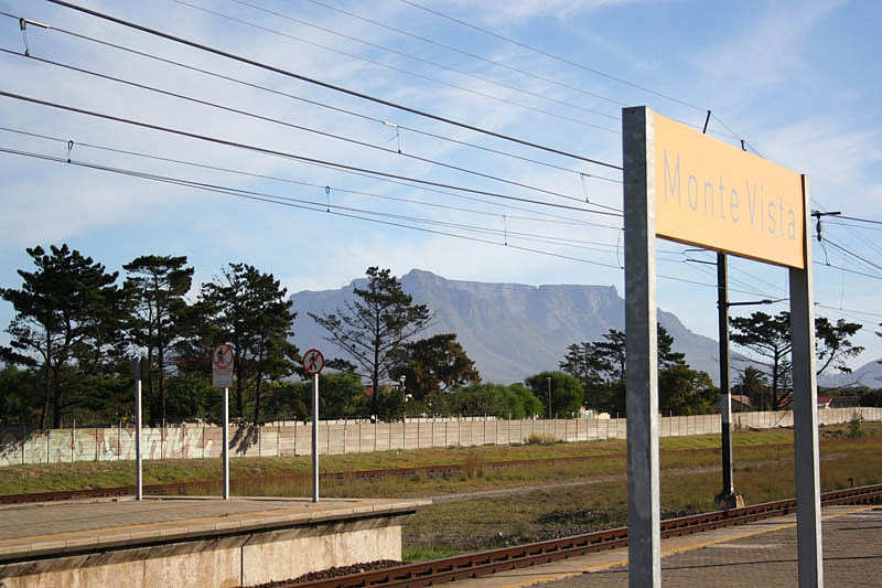 Monte Vista is 15 km from Cape Town. Situated on the main line north of Cape Town. All the Shozaloza and other Main Line passenger trains plus the normal Metro and interurban Metro run through here. Freight from the docks and Montegue Gardens hauled by Class 36 Diesels can also be seen. Steam is sadly all but gone.