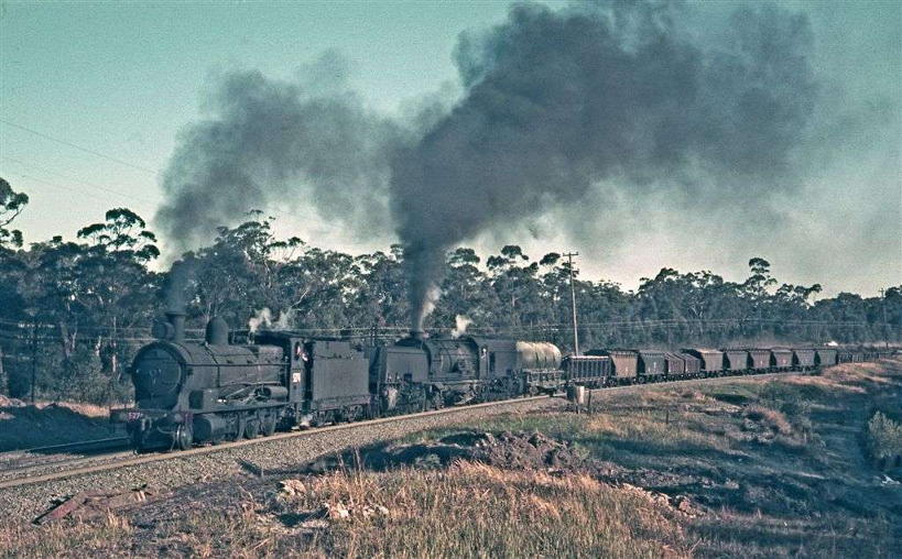 This is N.S.W. steam in it's final months; the 2-8-0 [5274 1911] was more at home on coal trains that loped along at 15-20 m.p.h. but is out on the mainline due to
