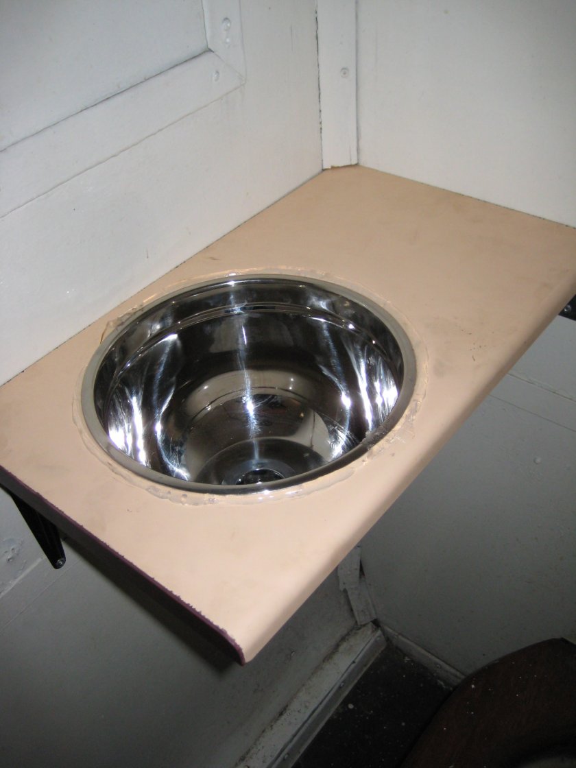 - Work on fitting washbasins to our toilet areas in the suburban coaches has just started. Here we see our contractor "Pekenese" doing a trial fit of the unit, before installation.