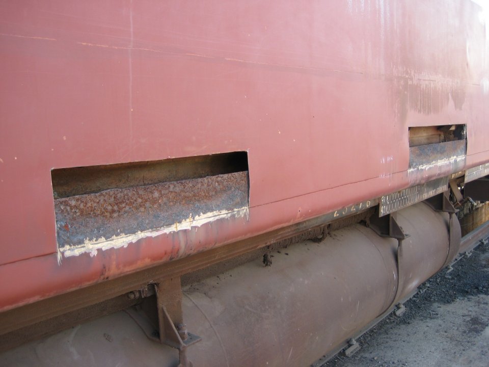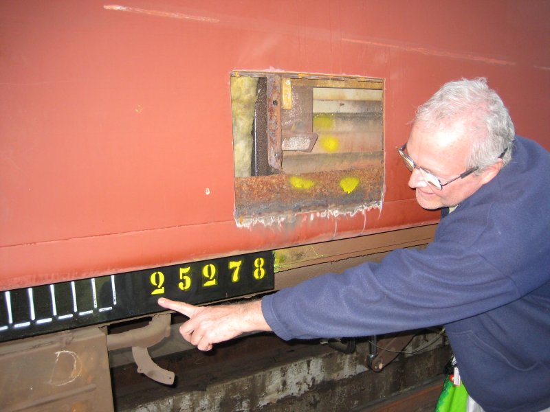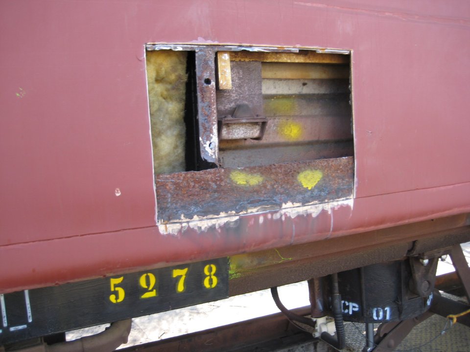 Our almost-renovated main line sitter coach has the rusty spots cut out of the side ready for new pieces to be welded in.