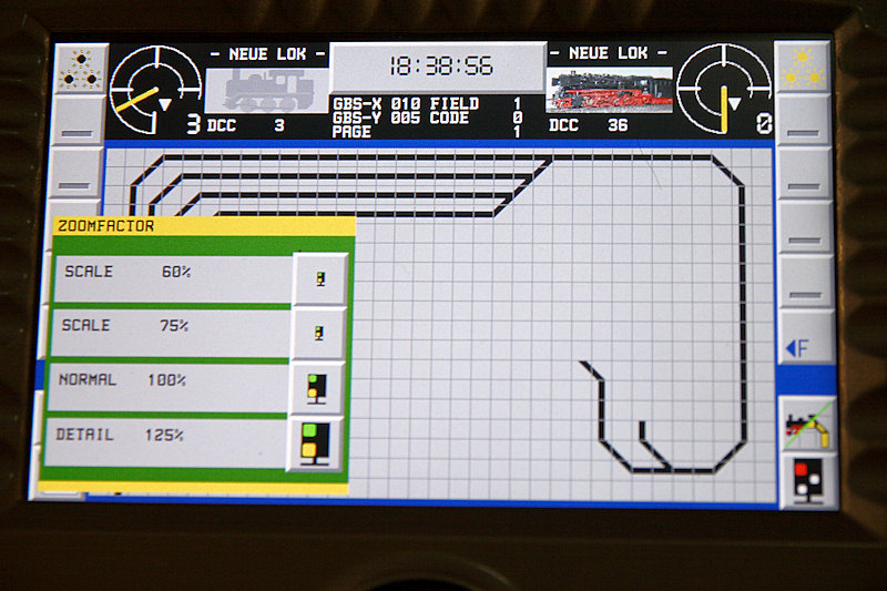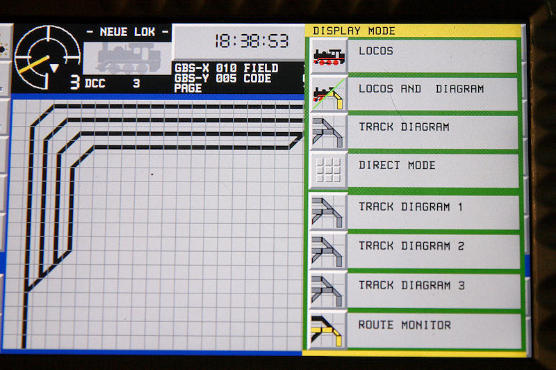 Photo 1 - Starting the unit up gives you a home screen similar to that shown. Function buttons down the side and selected locos at the top.