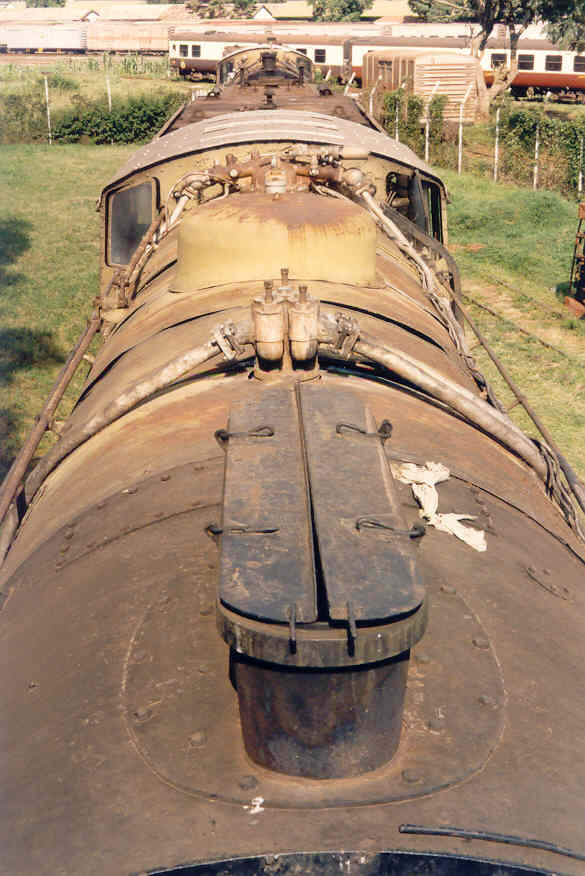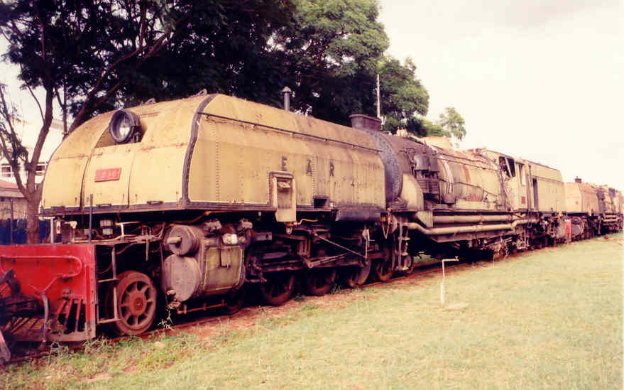 These are some pictures I took of the two Class 59 Garratts at the Nairobi Railway Museum in 1996. They were never painted that sand yellow colour. I was told by someone (can't remember who nor when) that the original maroon paintwork had faded to this colour.