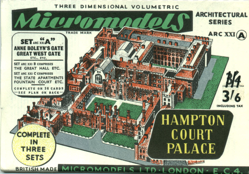 In the late forties, I used to make display models for the local toy shop in Grimsby. One day I went in and the owner gave me a micromodel of Hampton Court Palace and said, "See what you can do with this". I took that as a challenge and went to town! All the external doors were cut on two sides and pushed slightly open, with tiny pieces of brass wire to simulate hinges and door knobs. The windows were cut out and pieces of celluloid were criss crossed with indian ink and thinned down coloured paint was use to simulate leaded windows. I made deep plinth to mount it on and a battery inside with two torch bulbs in the model and when switched on gave a very nice glow in the windows. The shop owner showed it to the Micromodels rep and a few days later, a large envelope arrived at home. Micromodels had made a "Diploma of Excellence" for me, at 15 I was tickled pink! Owing to house moves and Army and Air Force service, it was lost, pity. It was nice while it lasted.