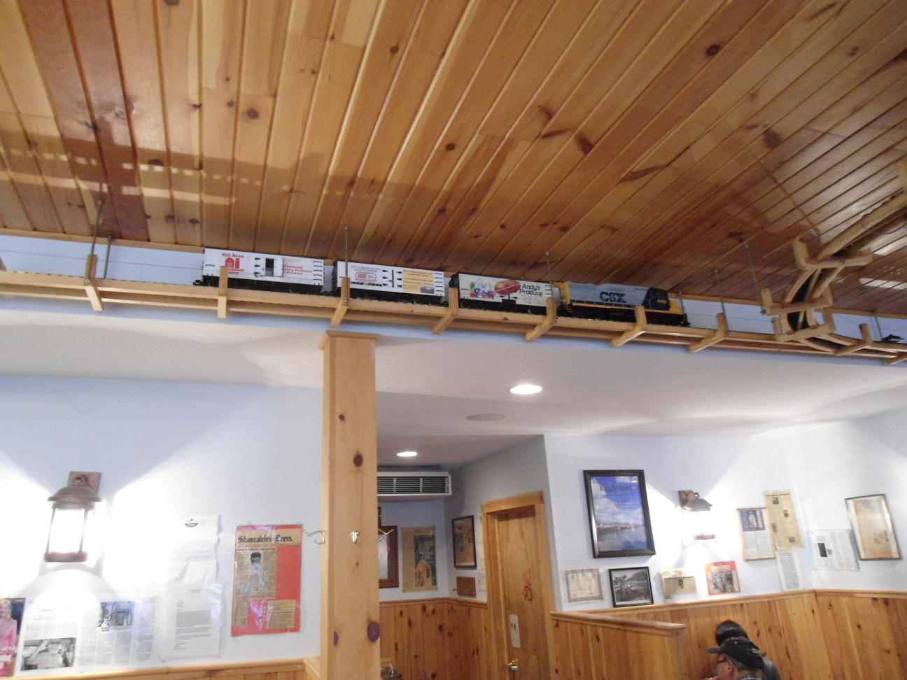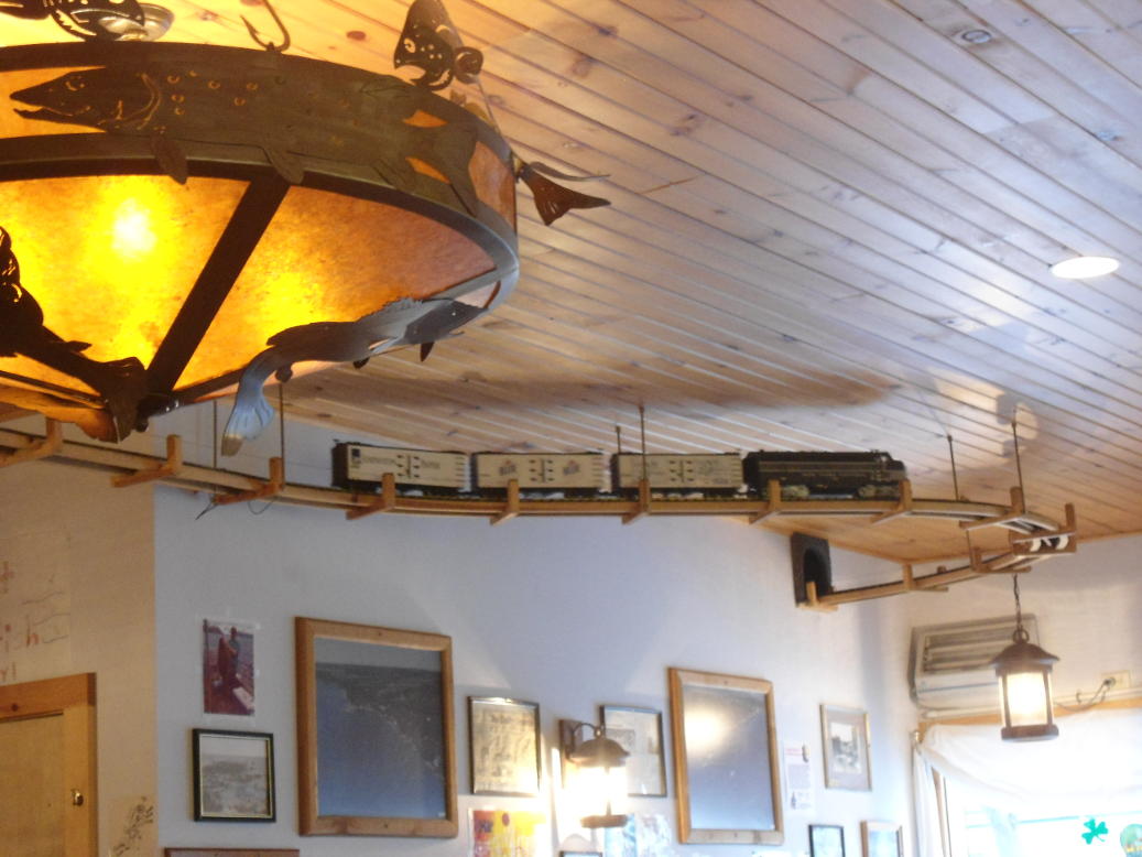 Suspended from the ceiling of a fish and chip shop, Doug's Fish Fries, in Skaneateles, New York State. 0 or 1 gauge? It has three different trains each consisting of a loco and about three cars, two of them in sidings at any one time. The food was pretty good too!