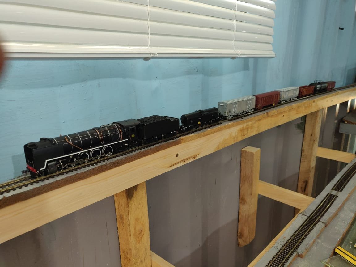 I've finally got enough track laid to run trains, mainly to test the track-laying and wiring. The two circuits, upper and lower level, are working fine with most locos and stock, although I may need to run an extra power feed to the far end, which is nearly 9m from the feed. The spiral between the two levels works, but not all the locos and rolling stock are happy with it, so I think I need to relay it. Some locos run better than others.