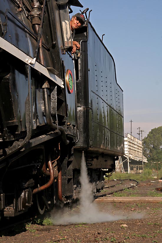 We trundle down to the shed where Rovos' 3442 is at the head of a dinner train, then set back to our compound. It is inspection time for the loco and she seems to have pulled through alright. We pose for some shots before Nathan takes her down to the coal stage and runs around, to stable her for servicing.